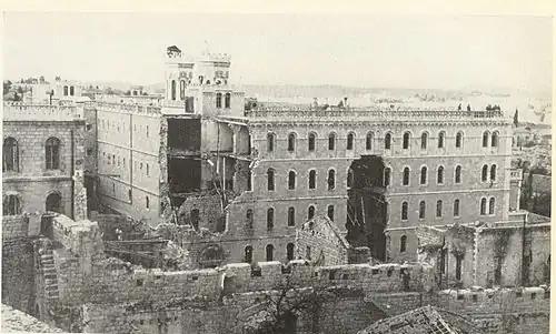 At the end of the war despite the damaged building, the Israeli army stayed put since they did not want to lose such a strategic position, and a small community of Assumptionists continued to live next to the main chapel. Many local refugees took refuge in the north wing and adjacent buildings, and the south wing was mostly destroyed and completely uninhabitable.[10]