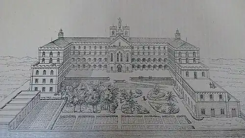 From 1894 to 1896 construction on the south wing took place. In this wing a second chapel was built that was dedicated to the Sacred Heart of Jesus and was opened in 1899. It did not belong to the original plan, but was requested and financed by Mr. Bontoux in memory of his deceased son.[5] Although this chapel disappeared after the reconstruction of the south wing in the 1970's, a large area of the space where it was is now a museum of the Holy Shroud of Turin.