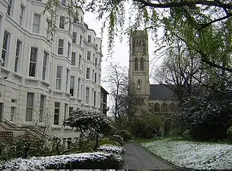 In 1837 the Hippodrome racecourse was laid out.[17] The racecourse ran around the hill, and bystanders were expected to watch from the summit of the hill. However, the venture was not a success, in part due to a public right of way which traversed the course, and in part due to the heavy clay of the neighbourhood which caused it to become waterlogged. The Hippodrome closed in 1841, after which development resumed and houses were built on the site. The crescent-shaped roads that circumvent the hill, such as Blenheim Crescent, Elgin Crescent, Stanley Crescent, Cornwall Crescent and Landsdowne Crescent, were built over the circular racecourse tracks. At the summit of hill stands the elegant St John's church, built in 1845 in the early English style, and which formed the centrepiece of the Ladbroke Estate development.