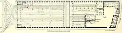 Initially the power for the electric tramway was provided by an existing power station in Talbot Street,[4] but the demands of the tramway required additional power. The first new power station was erected at the junction of St Ann’s Well Road and Millstone Lane. It comprised eight boilers and a chimney of 220 feet (67 m). This was under construction in December 1901 and opened shortly afterwards.[5] As of 2022 this building is home to Depot Climbing Nottingham.