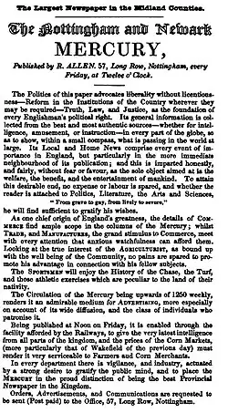 In 1834, Samuel Bennett succeeded Jonathan Dunn as publisher, but he died two years later in 1836[3] and was succeeded by Richard Allen when it changed its name to the Nottingham Mercury. In 1838 its sale was a little over 1,000 per week.