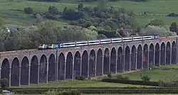 So the Midland Railway had authorisation for a cut-down scheme: Nottingham to Melton and Syston to Rushton. Both sections were designed for fast running by heavy trains, so earthworks were considerable to ensure gentle gradients. In order to carry the line across the wide valley of the River Welland north of Corby, a long viaduct was required, the railway passing through tunnels to the north and south of it. Called Harringworth Viaduct, it is the longest viaduct on the British Railway system excluding those carrying the London suburban lines.[12] It has 82 arches and a maximum height of 70 feet.[13] The contractor fell behind in the schedule for building the line, and the Midland had to get an extension of time, in an Act of 1878.[14]