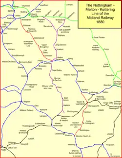 In November 1871 the Midland Railway deposited a Bill before Parliament entitled the "Nottingham and Rushton Lines Act". It proposed a line between Nottingham and Saxby, 21+1⁄2 miles long. It would pass some distance north of Melton Mowbray, and generally duplicate the Melton to Saxby section of the existing Peterborough line. The "Manton and Rushton Line" was a route 14 miles long between Manton on the Syston and Peterborough Railway, and Rushton on the Midland Main Line, north of Kettering. Included in the proposals was a spur linking the Nottingham and Saxby line to Melton Mowbray station.[10]