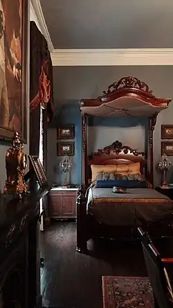 The main staircase of Honduran mahogany was covered in green velvet and ascended to the Ancestral Hall on the third floor. The hall was used by the Randolphs as a family parlor, as a central thoroughfare to many of the adjacent bedrooms, and gave access to the third-floor gallery with views of the Mississippi River. Nearby was the main bedroom, with one of the three original bathrooms, as well as a small room that was used as a nursery for Julia Marceline, Randolph's last and only child born at Nottoway. During the Civil War, Emily Randolph utilized a bedpost to hide valuable jewelry at the end of the bed. Though originally bedrooms, one had been made into a music room displaying 19th-century musical instruments, and another, known as the Wicker Room, featured wicker furniture owned by the Randolph family.