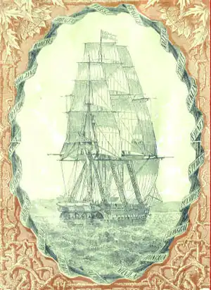 The Novara-Expedition report included a drawing of the frigate SMS Novara surrounded by an oval border with the names of locations visited: Gibraltar, Madeira, Rio de Janeiro, Cape Town, St. Paul island, Ceylon, Madras, Nicobar Islands, Singapore, Batavia, Manila, Hong Kong, Shanghai, Puynipet Island, Stewart Island or Stuart Island (16-17 October 1858),[5] Sydney (5 November 1858), Auckland, Tahiti, Valparaíso, Gravosa, and Triest (returning on 26 August 1859).
