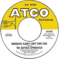 "Nowadays Clancy Can't Even Sing" is a song by the Canadian-American folk rock band Buffalo Springfield, released as the group's debut single in August 1966.[1] Neil Young wrote the song in Yorkville in 1965 shortly after returning from a series of performances in Toronto, during a period when his bid at a solo career had been met with little positive response. The lyrics reflect metaphorically on Young's frustration toward his stalled career in music, and was inspired by Ross "Clancy" Smith, an aberrant classmate who incited awe in his school. Commentators recognize "Nowadays Clancy Can't Even Sing" as one of Buffalo Springfield's signature songs, as well as a milestone in Young's progression as a songwriter.