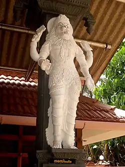 In the second part, a long chapter, the significance of the Nrisimha Mantra as an important hymn to recite to overcome death and enjoy family life is emphasized.[11] The key words used in the Nrisimha Mantra to worship Nrisimha are: "Ugra (fierce), Veera (heroic), Maha Vishnu, Jwalantham (burning), Nrisimha (half man and half lion), Trivikrama (one who measures the world in three steps), Bheeshanam (fear full), Bhadram (safe), and Mruthyu-Mruthyum (death and deathlessness).”[9]