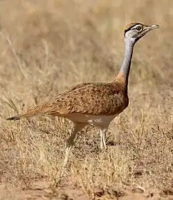 The Nubian bustard (Neotis nuba) is a species of bird in the bustard family. This is a medium-large bustard, found in the sparsely vegetated interface between the southern margins of the Sahara desert and the northern part of the Sahel. It is found in Burkina Faso, Cameroon, Chad, Mali, Mauritania, Niger, Nigeria, and Sudan. Its natural habitats are dry savanna and subtropical or tropical dry shrubland. Formerly common in this region, it is now very rare.[3]