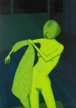 If his subject was not glowing with an almost fluorescent, irradiated green, this would be one of Brack's most sensual pictures. His model is lithe, adorned with a fashionable 1960s-style bob. She is far from Rubenesque, but the twist of hip is distinctly feminine. ... But any sensuality is counterbalanced by Brack's garish colouration.