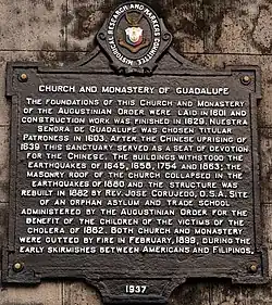 The first sanctuary and monastery in Guadalupe was built by Simón Dantes. This foundation was declared a domus formata or a community under the advocacy of Our Lady of Grace through a Provincial Chapter on March 7, 1601.[2] One year after, the community in Guadalupe was given the right to vote in the provincial chapters.