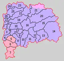 In the cadastral reforms of the early Meiji period, on October 1, 1889, Nukata District was divided into one town (Okazaki) and 26 villages. The village of Fukuoka was raised to town status on November 8, 1893, followed by Hirohata village on May 13, 1895. In a round of consolidation in May 1906, the remaining number of villages was reduced from 24 to 15. The town of Hirohata was annexed by Okazaki on October 1, 1914. Okazaki attained city status on July 1, 1916. The village of Iwazu became a town on September 1, 1928 and later the same year, three neighboring villages were annexed by Okazaki, leaving the district with two towns and 11villages.