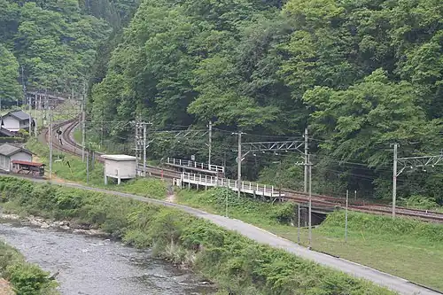 There is only the Nishikawa River and a few houses near the station. Since the Kawamoto Dam was built downstream of the Nishikawa River, the dam lake extends through a narrow V-shaped valley toward Nunohara Station, but the dam lake does not reach the station. In the past, when steam locomotives were running on the Hakubi Line, Nunohara was still a signal station, and was known as a photography spot for train enthusiasts .