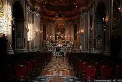 The interior of the church has a basilica plan with lateral chapels. Frescoes that depict the Adoration of the Magi in the apse and the Assumption of the Virgin in the ceiling are by are mainly by Francesco de Mura. Also in the Apse is a series of paintings depicting the Life of Mary by Ludovico Mazzanti, who also painted the four saints in the counterfacade. The main altar and balustrade in polychrome marble and bronze decoration (1756) was made by Giuseppe Sanmartino.
