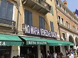"No Mafia Venezia è Sacra" (No Mafia Venice is Sacred) banner hanging over a restaurant in Venice across from the Rialto Bridge in 2019.