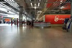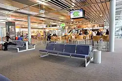 The passenger terminal consists of two departure halls and one arrival hall which are all linked landside and airside. The check-in area features 40 desks.[67] In December 2015 the new security control between departure halls 1 and 2 on the ground floor opened, replacing earlier facilities upstairs in hall 2 as machines had gotten too heavy to be placed on the upper floor.[68] The newly freed up space on the upper floor has been converted to offices of travel bureaus selling their products and services right at the airport.
