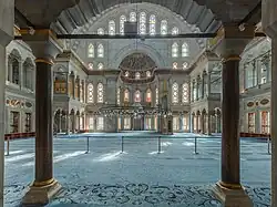 Inside, the mosque's prayer hall is flanked by symmetrical two-story galleries that extend outside the main perimeter of the hall. The corners of these galleries, on either side of the mihrab area, include a space for the muezzins on one side and a space for the sultan's loge (hünkâr mahfili) on the other, thus dispensing with the traditional müezzin mahfili platform in the middle of the mosque. This gallery arrangement leaves the central space unencumbered while still dissimulating the supporting piers of the dome.[27] The most exuberant Baroque carvings, such as flutes and scroll forms, are found on the minbar.[28] The hood of the mihrab, like the semi-vaults above the exterior doorways, is carved with a mix of eclectic friezes that replace the traditional muqarnas.[29] The mosque's stone decoration also establishes a new style of capitals that distinguishes the Ottoman Baroque: a vase or inverse bell shape, either plain or decorated, usually with small but prominent volutes at its corners, similar to Ionic capitals.[30][31] The prayer hall is also lined with golden Qur'anic calligraphy and has medallions with name of Allah and Muhammad on the pendentives of the dome.
