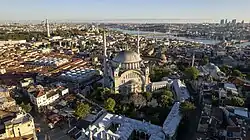 From the outside, the dome sits above four huge arches (one for each side of the square) pierced with many windows that provide light to the interior. The closest precedent to this design in Classical Ottoman architecture is the Mihrimah Sultan Mosque in the Edirnekapi neighbourhood of Istanbul.[21][22] The projecting apse which contains the mihrab is also comparable to the Selimiye Mosque in Edirne.[21] The complex has two minarets, each with two balconies. The courtyard of the mosque is designed in the shape of a horseshoe, unprecedented in Ottoman mosques.[8]