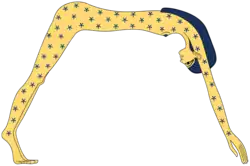 Nut is also the barrier separating the forces of chaos from the ordered cosmos in the world. She was pictured as a woman arched on her toes and fingertips over the Earth; her body portrayed as a star-filled sky. Nut's fingers and toes were believed to touch the four cardinal points or directions of north, south, east, and west.
