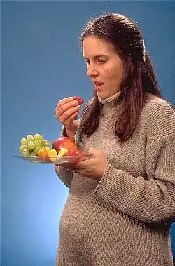 Pregnant women are advised to pay attention to the foods they eat during pregnancy to reduce the risk of exposure to substances or bacteria that may be harmful to the developing fetus. This can include potentially harmful pathogens such as listeria, toxoplasmosis, and salmonella.[7] Intake of large amounts of retinol has been linked to birth defects and abnormalities.[38]