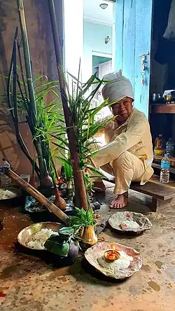 The nuwāgi cycle celebrates the first fruits offering and is the most important ritual occasion during the harvest season in autumn, in the month of Kārtik (October/ November). The ancestors are presented with the new rice or millet, and only after they have eaten can the household consume the newly harvested grains. Thus it is a happy occasion: it is a time when the work of the year is about to be completed, the hard days of food scarcity (Nep. anikāl) are over and food is plentiful again. As a good harvest depends on the support of the ancestors, they have to be satisfied and given their share. As honoured guests, they are invited and given the best of foods before everybody else, and they are asked to remain benevolent and supportive. The nuwāgi is a half-day feast marked by a communal meal to which a good number of relatives and neighbours are invited.[6]