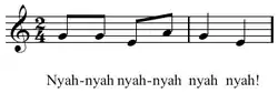 - ^ Sometimes five-note, with the first two notes combined as one long note ("Nyaaahh nyah nyah nyah nyah") or other variations, such as the third note shortened or the fifth note stressed in volume, intonation, or duration, and so forth.
