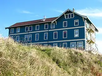 By the close of the 19th century, numerous summer cottages populated the area and camping enthusiasts pitched tents in campgrounds established along Nye Creek. By 1902 shops began to appear, soon followed by boarding houses, hotels and recreational attractions. The Cliff House Hotel, completed in 1913, still stands on a Nye Beach sea cliff, having morphed first into the Hotel Gilmore (1921) and again in 1986 into a whimsical haven for readers and writers, the Sylvia Beach Hotel.[8]