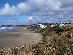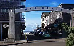 Nye Beach is a central district in Newport in the U.S. state of Oregon. The Nye Beach historic overlay district is bounded on the north and south sides by Northwest Twelfth Street and Southwest Second Street respectively; on the east side by Hurbert Street and on the west side by the Pacific Ocean.[1] Situated on a sea cliff, the district has been a popular vacation spot since the late 19th century. Cultural and literary groups such as Oregon Coast Council for the Arts, Yaquina Art Association, and Writers on the Edge are based in Nye Beach, as are Newport's Performing Arts and Visual Arts Centers. The beach attracts tide-pool enthusiasts and beachcombers as well as surfers, sail-boarders, crabbers, clam diggers, kite flyers, photographers, and artists and has also been the site of marine and geological research projects.