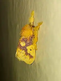The wingspan of the female is about 38 mm. Antennae are bipectinate (comb like on both sides). Forewings are bright orange yellow and covered with slightly powdered black scales. The head, thorax and abdomen are hairy. Anal tufts are orange yellow. A rusty coloured band runs from near the base of the forewing. A black spot is present at the end of the cell. There are long black hairs on the inner margin. the palpi are porrect (extending forward) and reach beyond the frons. The hindwing and cilia are pale orange yellow.[3] The caterpillar is dull black with yellow longitudinal bands and is marbled with brown. The ventral side is jet black. Pupation occurs within a woven, silken cocoon.[4] The caterpillar is known to feed on Dendrophthoe glabrescens, Loranthus[5] and Mallotus paniculatus.[6]