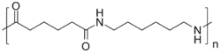 Nylon 66 (loosely written nylon 6-6, nylon 6/6, nylon 6,6, or nylon 6:6) is a type of polyamide or nylon. It, and nylon 6, are the two most common for textile and plastic industries. Nylon 66 is made of two monomers each containing six carbon atoms, hexamethylenediamine and adipic acid, which give nylon 66 its name.[1] Aside from its superior physical characteristics, nylon 66 is attractive because its precursors are inexpensive.