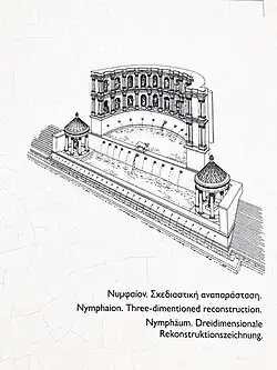 - ^ Noting that the use of the term Nymphaeum for secular purposes dates to the 2nd century, Aristodemou distinguishes several types of Roman Nymphaea: 1. Caves 2. Royal (rectangular with arch and apse) 3. Cascading, or water theatre 4a. "Sigmoid" (exedrae or fountain-houses, such as the Olympic) 4b. Rectilinear 4c. Row of niches.