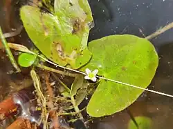 Floating leaves pale green –brownish green with pinkish tinge; seed surface tuberculated.[3] The flowers are bisexual, 3-4 white petals with yellow throat and toothed edges.[3]