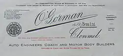 John F.O'Gorman completed his learning in London and was appointed by the Department of Agricultural and Technical Instruction, to teach the Theory of Road Carriage Building. He first traded as O'Gorman Bros, Address: 12 Wellington Street, Clonmel.[1] and advertised 'Motor Bodies of every description built on the premises'. They were special Agents for Austin, Humber and Ford cars. Shortly after the First World War, John F. O'Gorman went to Germany and captured the first main dealership in Ireland for Mercedes-Benz cars.
