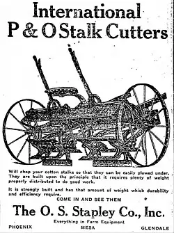 In June 1912, O. S. Stapley and Company opened a second store, on the corner of Robson and Main in Mesa. They moved all their furniture stock to the new location, while retaining the original store for their hardware business, which was housed in three buildings on the south side of Main Street.[17] In October of that year, the two entities split, with Stapley selling off the furniture portion of his business to his two partners, J. W. Clark and J. S. Rogers. The new hardware company was simply called the O. S. Stapley Company.[18] His second hardware store was opened in 1917 in Phoenix. It had entrances on both Grand Avenue and Seventh Avenue.[19] In approximately 1908 he became the local dealer for the International Harvester Company, which had just been formed. He would eventually become the largest IHC dealer in the United States.[4] 1919 saw Stapley open a third store, this time in Glendale.[20] Stapley would open two other locations, one in Chandler, and the other in Buckeye.[3]