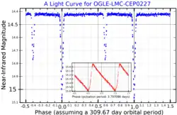 OGLE-LMC-CEP0227 is an eclipsing binary and Cepheid variable star,[6] pulsating every 3.8 days.[4] The star, in the Large Magellanic Cloud, was the first Cepheid star system found to be orbiting exactly edge on.[4]