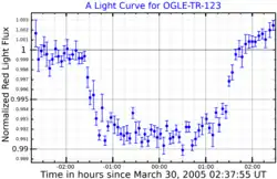 ![]() A light curve showing the March 30, 2005 planet transit across OGLE-TR-123. Adapted from Pont et al. (2006)[1] | |