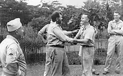 Eifler held the rank of colonel when he was relieved because of serious head injuries, Lt. Col. William R. Peers taking over command. At the end of the war, each Kachin Ranger received the CMA (Citation for Military Assistance) Award.[Note 1] Actually, the medal was the result of a mistake. An OSS officer, reading a radio message that advised him how to reward heroic Kachin action, misinterpreted the abbreviation for "comma" ("CMA") as signifying some sort of a medal. Reluctant to leave the Kachins empty handed, the OSS quickly created the medal and presented it to them.[7]