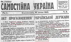 During the Second World War, in 1940, the OUN split into two parts. The older, more moderate members supported Andriy Melnyk's OUN-M, while the younger and more radical members supported Stepan Bandera's OUN-B. On 30 June 1941 OUN-B declared an independent Ukrainian state in Lviv, which had just come under Nazi Germany's control in the early stages of the Axis invasion of the Soviet Union.[28] OUN-B pledged to work closely with Germany, which was described as freeing the Ukrainians from Soviet oppression, and OUN-B members subsequently took part in the Lviv pogroms.[29] In response to the OUN-B declaration of independence, the Nazi authorities suppressed the OUN leadership. Members of the OUN took an active part in the Holocaust in Ukraine and Poland. In October 1942, OUN-B established the Ukrainian Insurgent Army (UPA).[nb 5] In 1943–1944, in an effort to prevent Polish efforts to re-establish prewar borders,[36] UPA units carried out massacres of Poles in Volhynia and Eastern Galicia.[28]