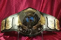 The OVW Heavyweight Championship is a professional wrestling World heavyweight championship owned by the Ohio Valley Wrestling (OVW) promotion. The original championship was designed and created in 1997 by Reggie Parks. The title was introduced on August 17, 1997, at an OVW live event, then known as the NWA-OVW Heavyweight Championship due to OVW's relationship with the National Wrestling Alliance (NWA) governing body. OVW eventually parted ways with the NWA in October 2001, and the title was renamed the OVW Heavyweight Championship. OVW later became a developmental territory for the World Wrestling Entertainment organization, but their partnership eventually ceased on February 7, 2008.[2] The title has no known weight-limit, even though it is a heavyweight championship. The title has also went through almost 3 different versions in its current twenty-five year run. With The first being made by Reggie Parks in 1997, which was then retired and vacated in early 2012. The second version would then be made by Reggie Parks and Dave Millican for OVW.[3] The current version however was designed and created by Top Rope Belts, and ended up being used from 2012 to the present day.[4]