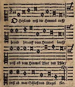 "O Heiland, reiß die Himmel auf" (O Saviour, tear open the heavens)[1] is a Christian Advent song. The text was first printed in 1622, attributed to Friedrich Spee; the melody was first printed in 1666.