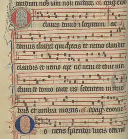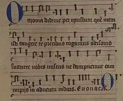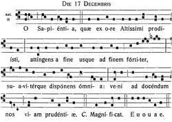 The O Antiphons (also known as the Great Advent Antiphons or Great Os) are antiphons used at Vespers during the Magnificat on the last seven days of Advent in Western Christian traditions.[1] They likely date to sixth-century Italy, when Boethius refers to the text in The Consolation of Philosophy.[2] They subsequently became one of the key musical features of the days leading up to Christmas.[3]