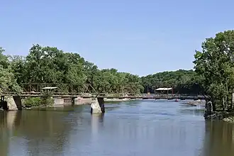 The Oakland Mills Bridge is a historic structure located in Oakland Mills Park southwest of Mount Pleasant, Iowa, United States. The span carried Hickory Road over the Skunk River for 358 feet (109 m).[2] In July 1876 the Henry County Board of Supervisors decided to locate the bridge over the Skunk River at Oakland Mills. After engineers looked over the proposals, they choose the Missouri Valley Bridge and Iron Company of Leavenworth, Kansas to build the structure. The long-span combination Pratt truss through and pony truss was completed later the same year. The steel components where manufactured by the Phoenix Iron Company of Pennsylvania. It is one of the oldest Pratt through truss bridges in Iowa.[2] Long closed to vehicular traffic, it was listed on the National Register of Historic Places in 1998.[1]
