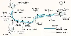 The wye is a flying junction that is approximately centered underneath Broadway and 9th Streets. Trains coming from the underground 12th Street Oakland City Center station (with platforms on two levels) approach the wye from underneath Broadway and those from the underground Lake Merritt station approach from approximately underneath 9th Street. Those trains coming from the elevated West Oakland station enter tunnel portals near Washington and 5th Streets before turning towards Broadway. An additional third track (labeled MX/CX in the schematic diagram) provides additional capacity between West Oakland and 12th Street, and is normally used by Antioch-bound trains.[7] Emergency exit/access points are located in a small building at 7th & Broadway with access to the A and M lines and a sidewalk hatch at 9th & Harrison with access to the A and C lines.[5]