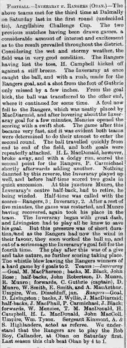 Four days after the tie, clubs in the county met to form a new Argyllshire Football Association, and set up a cup competition.[12] The first round of the county tournament saw the club's only victory in a competitive match; the club originally drew 1–1 with Inveraray, a shinty side playing its first football match,[13] and Rangers finished a man short after Macmillan left the field exhausted;[14] Inveraray had two goals chalked off for offside.[15] The replay at Oban ended 3–3[16] and a second replay, at Dalmally, finally fell to the Rangers. The club met Oban in the semi-final, drawing 3–3 having largely dominated the game and having a goal disallowed;[17] the Rangers lost the brothers MacDonald for the replay and lost 4–1.[18]