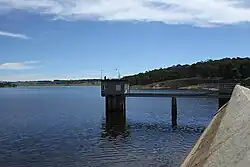 Commenced in 1943, completed over two stages in 1959, and upgraded in 1996, the Oberon Dam is a major dam on the Fish River (formerly, Fish River Creek), located approximately 3 kilometres (1.9 mi) upstream, south-east of Oberon. The dam was built by the NSW Department of Public Works on behalf of the New South Wales Department of Land and Water Conservation. The original intent of the works was to supply water to the National Oil Proprietary Ltd's refinery at Glen Davis in the western coal fields, factories at Lithgow, and supporting populations.[1][2][3] Water from Oberon Dam feeds the Fish River Water Supply, which is a unique regional water supply scheme and is the only scheme in eastern Australia to transfer western flowing water to areas east of the Great Dividing Range.[1]