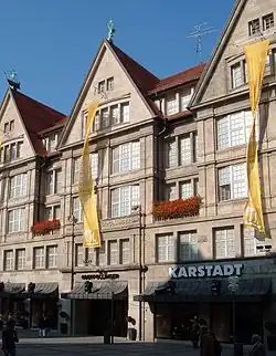 Max Littmann designed the department store according to the most modern possibilities of his time. The iron frame structure consisted of beams that were aligned on a grid. They were covered with concrete for fire protection. The facades are clad with shell limestone, the decorative elements of the facades come from the sculptors Heinrich Düll and Georg Pezold.