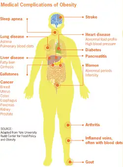 - ^ a b c d e f g h i j k Haslam DW, James WP (October 2005). "Obesity". The Lancet. 366 (9492): 1197–209. doi:10.1016/S0140-6736(05)67483-1. PMID 16198769. S2CID 208791491.