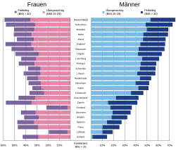 The number of overweight people in Germany has stagnated between 1998 and December 2011.[11] 67.1% of all men between 18 and 79 are considered overweight with a BMI of 25 or greater.[11] In 2019, the proportion of overweight and obese people in Germany was at an average level for the EU-27.[12]