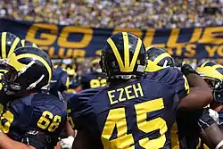 During the 2010 NCAA Division I FBS football season he started the first six games for the 2010 Michigan Wolverines football team before losing the starting middle linebacker position to Kenny Demens.[62] Ezeh's final regular start was against Michigan State on October 9, when he tied his season-high with nine tackles and boosted his career total against Michigan State to 46.[63][64] When Jonas Mouton was unavailable for the Purdue game on November 13 due to a chest injury,[65] Ezeh stepped in and recorded his first sack of the season as well as eight solo tackles.[63]