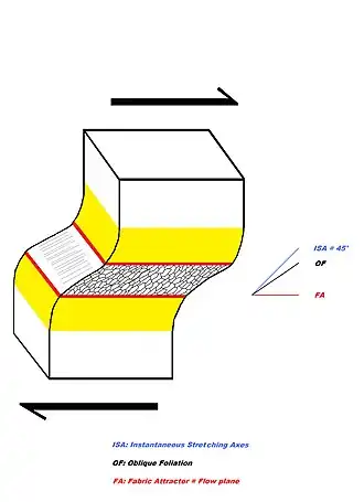 Oblique foliation is mainly encountered in shear zones, where it forms as a result of the shearing deformations within the affected zone. As the name implies, this foliation/fabric takes on an oblique attitude to the shear-zone boundary (i.e. the fabric attractor) and internal layering, usually an angle of about 20°–40°, or less. (In some shear zones, even angles less than 5° are reported, yet angles steeper than 45° are also known). A closer look reveals that the foliation/fabric is created by the parallel arrangement of a multitude of similar oriented small grains, which are slightly elongated in the foliation direction.[1] Oblique foliation thus represents primarily a shape-preferred orientation (SPO).