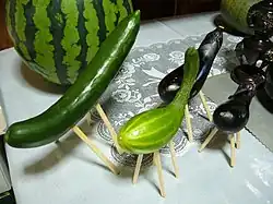 Another significant ritual practiced during the Obon festival in Japan is to craft a cucumber horse and eggplant cow, known as shōryō uma (精霊馬, "spirit horse") or ushi uma (牛馬, "cow horse"),[15][16] that act as a vessel for the ancestors to come back home and return, respectively.[17]